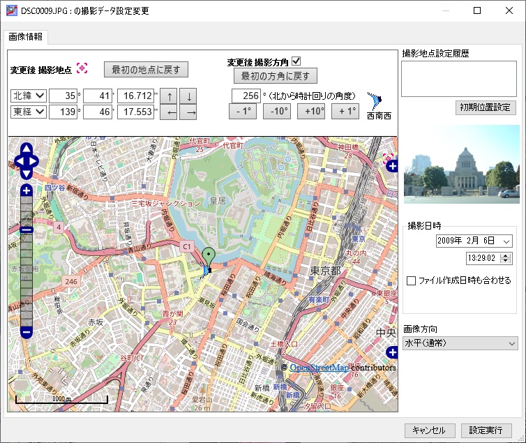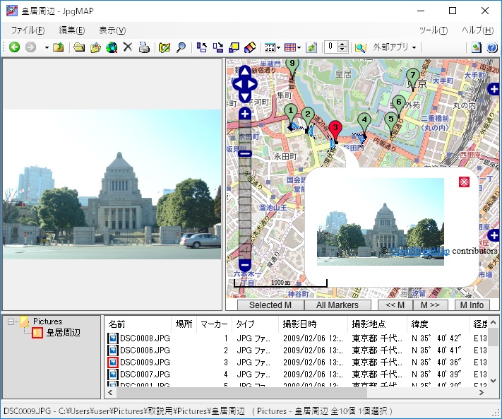 撮影位置を持ったデジカメ(Jpeg)画像であれば、地図表示エリアのマーカーが選択されます。