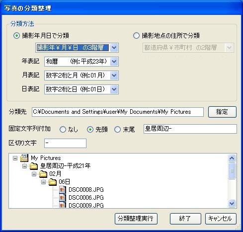 マウス右メニューの「写真の分類整理」が選択された場合、表示されます。 選択された写真ファイルを分類方法に従って階層化してフォルダに保存します。