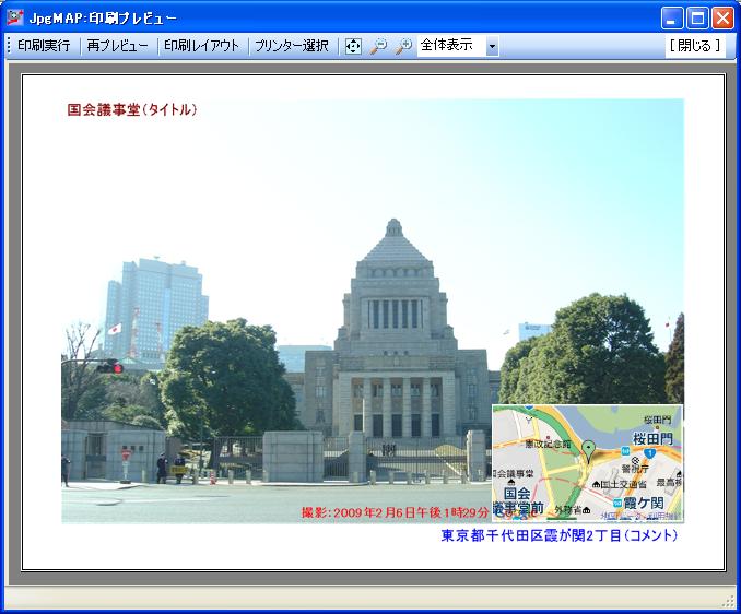レイアウト表示を見ながら、地図、タイトル、撮影日時、コメントの内容、位置の設定、印刷用紙の設定が行えます。